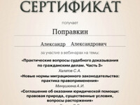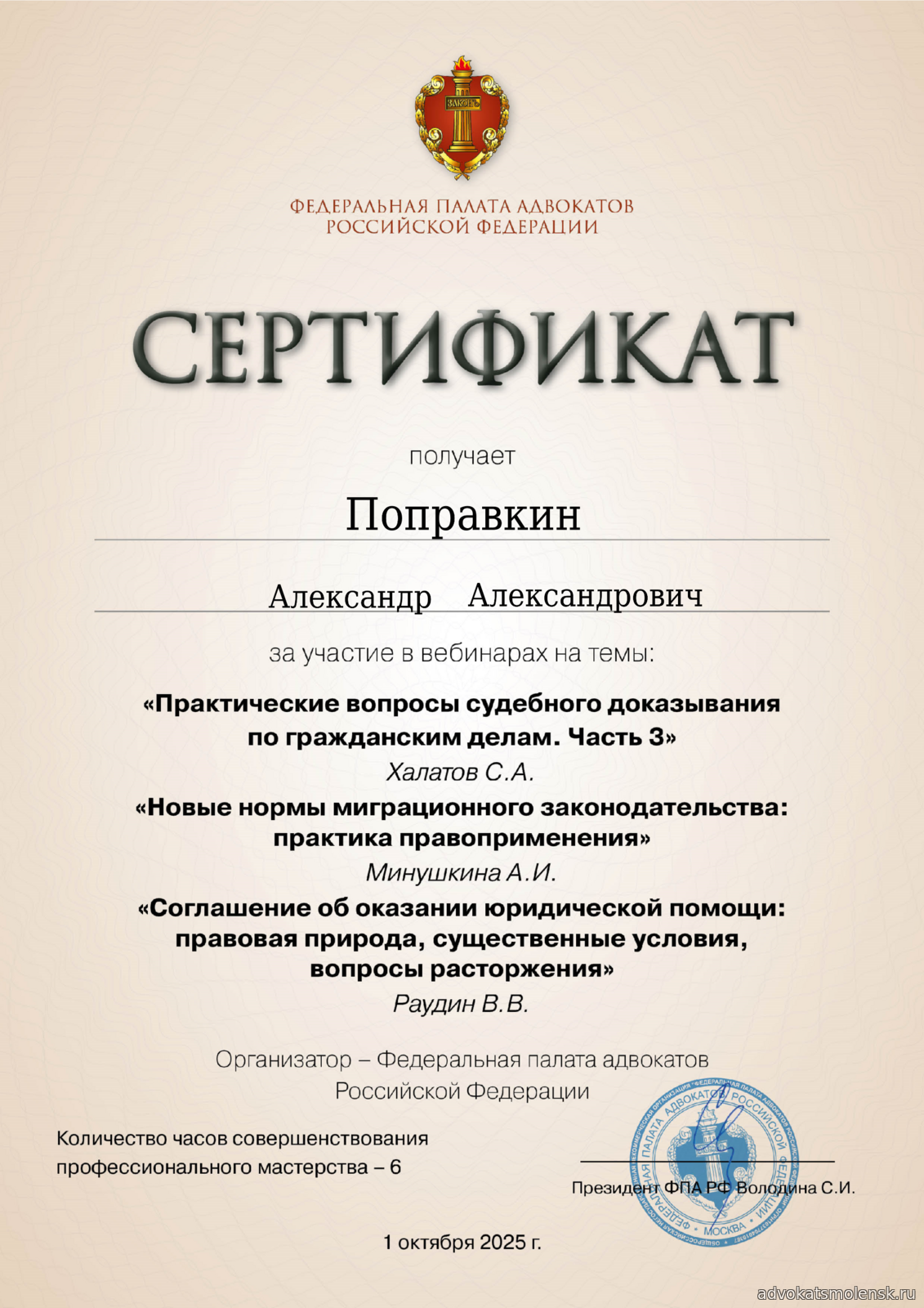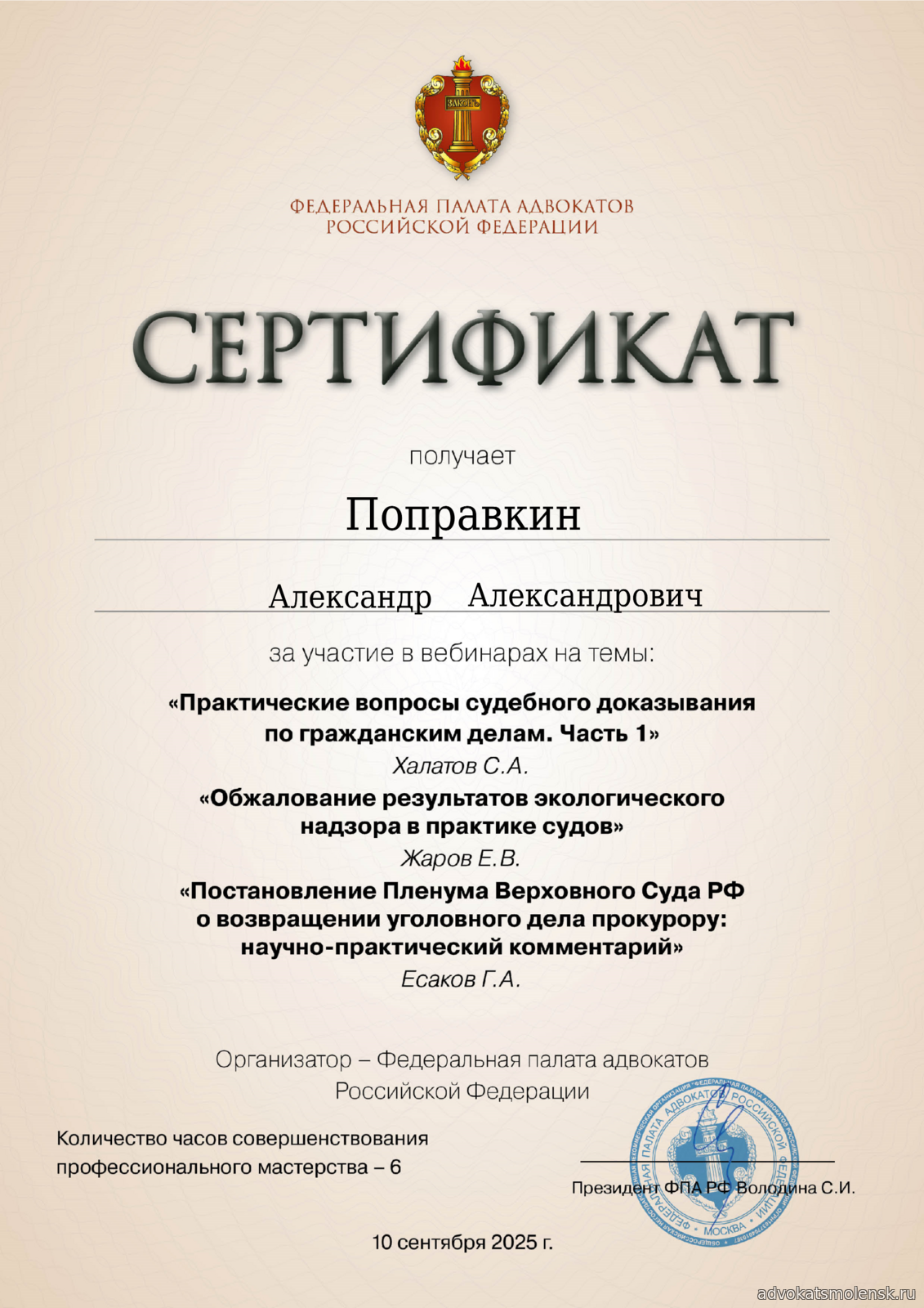 Сертификат ФПА РФ Адвокат Поправкин 19.09.2024