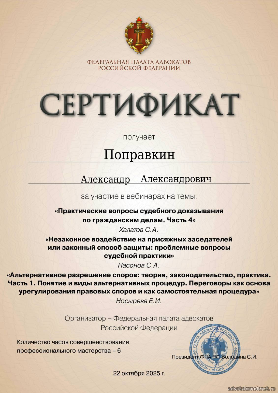 Сертификат ФПА РФ Адвокат Поправкин А.А 16.10.2024